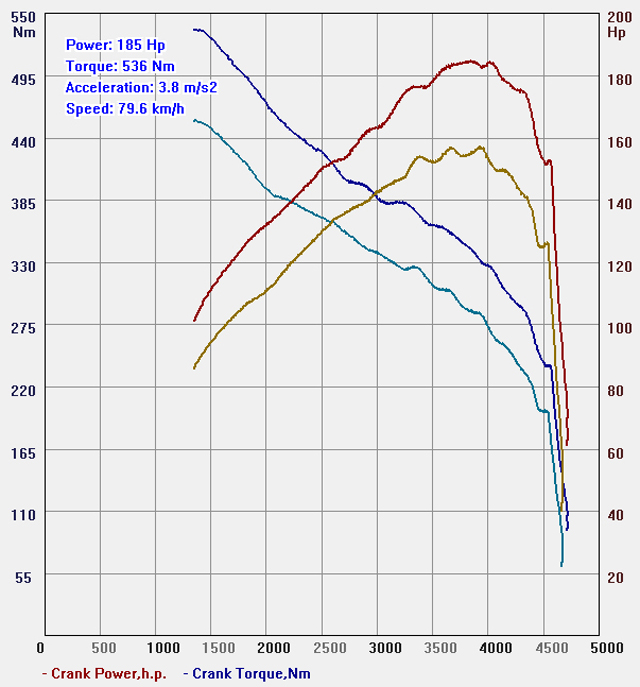 (Отсутствие данных о значениях мощности-момнта в диапазоне до 1300 об/мин связан с нюансами работы автомата данного автомобиля и измерительной аппаратуры)